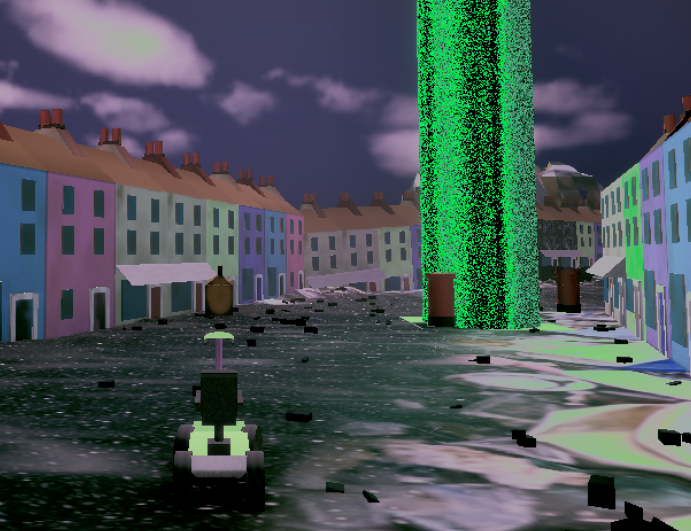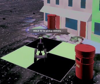 Find the pickup zones and grab a delivery. Enjoy the ride of the mobility scooter on your way to the giant pillar of light to drop off the package.